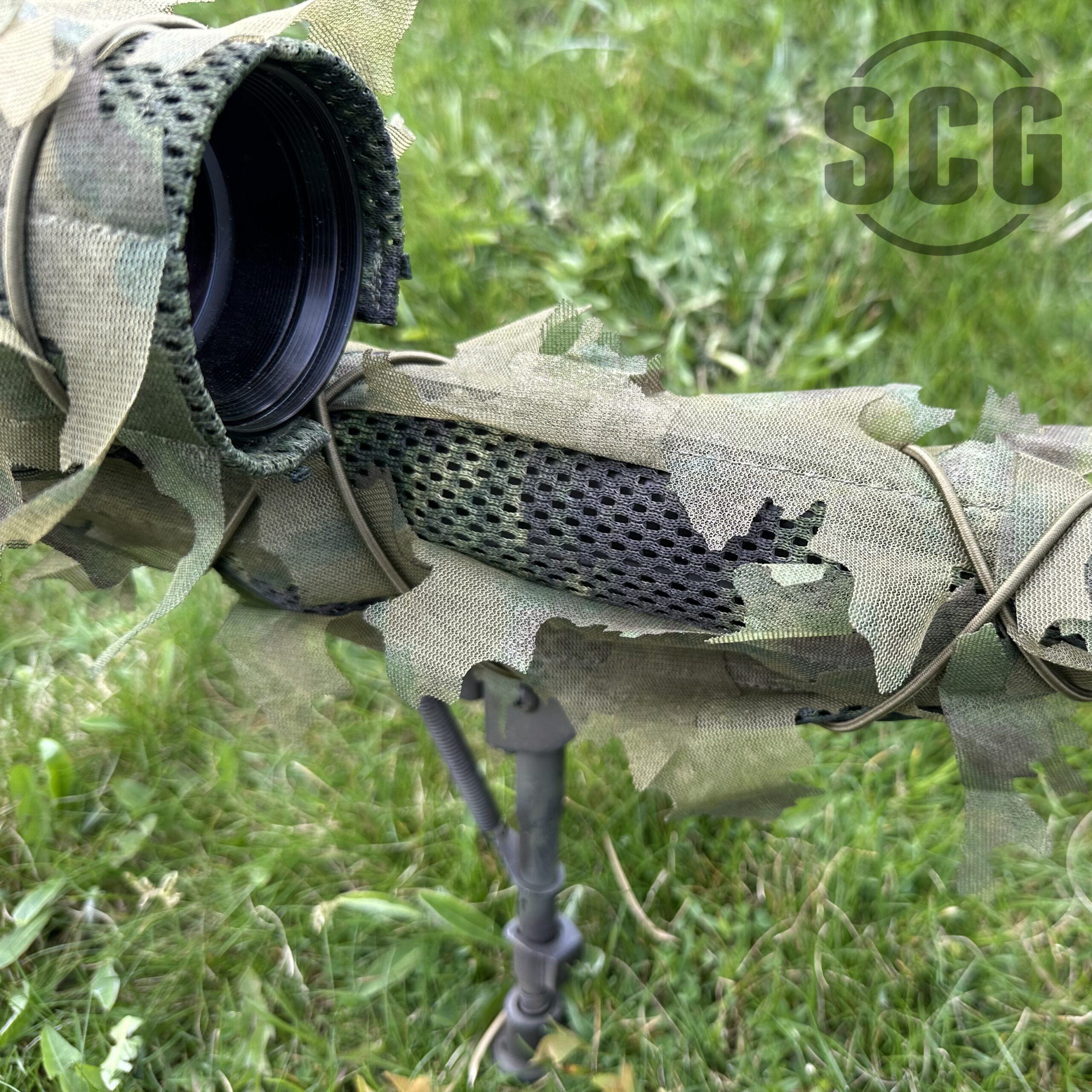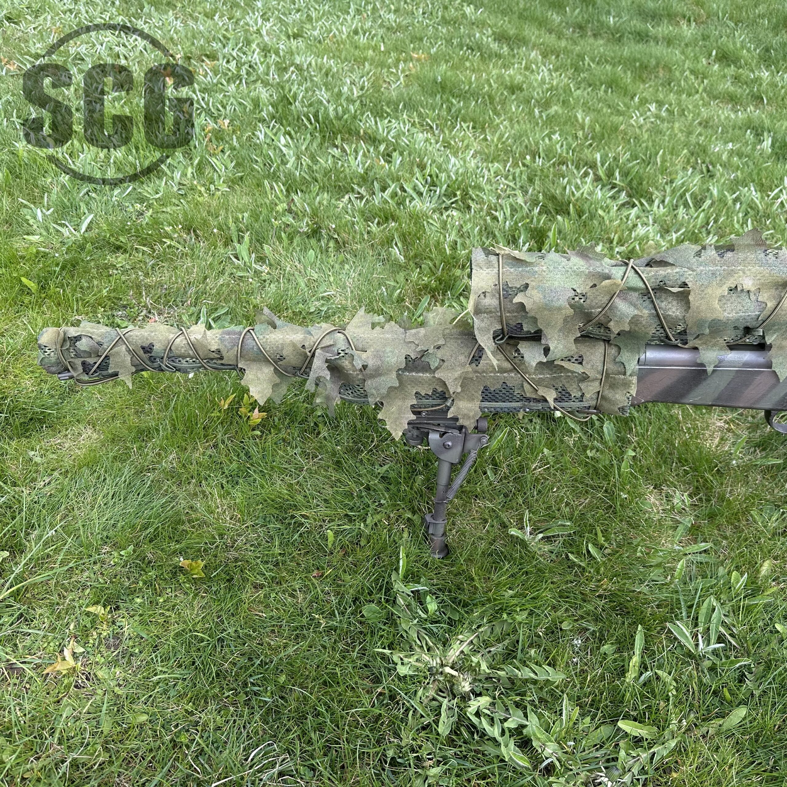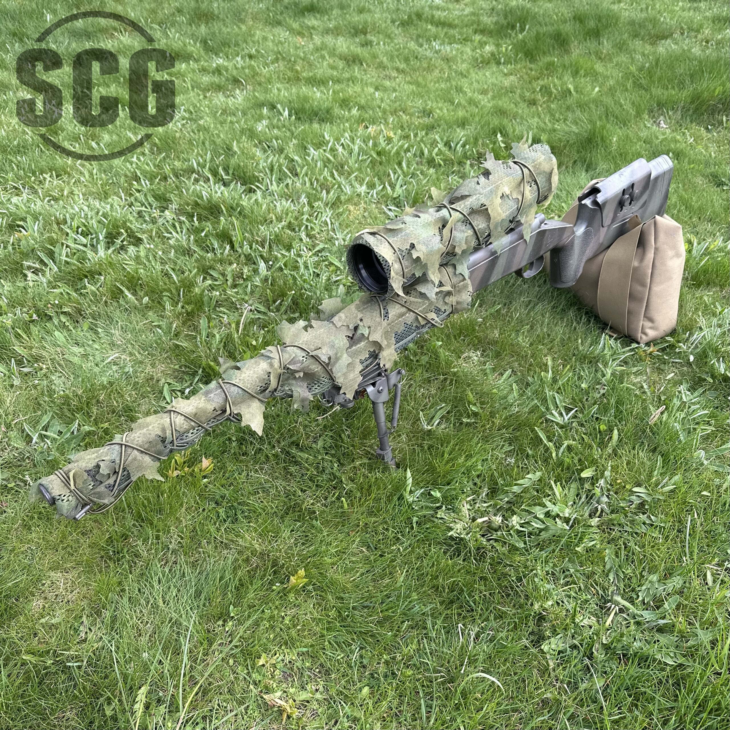 Rifle Camo System Recce Line 3D ATACS to kompletny system maskowania dla karabinów wyborowych. Produkt w wersji z naszytymi liśćmi maskującymi w kamuflażu ATACS FG, baza maskowania w ATACS FGX.